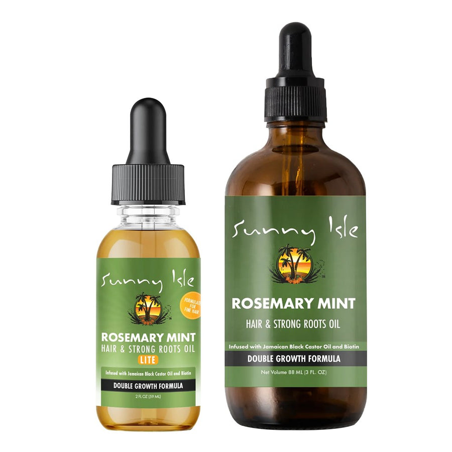 The Sunny Isle nutrient-rich Rosemary Mint Hair and Strong Roots Oil infused with our Jamaican  Black Castor Oil and Biotin is proud to present our innovative Double Growth Formula!  This can be used as part of your everyday hair care routine, or as an INTENSIVE Deep Treatment to Prevent, Repair and  Replenish damaged roots resuscitating  damaged hair back to its healthy, voluminous and lustrous state.