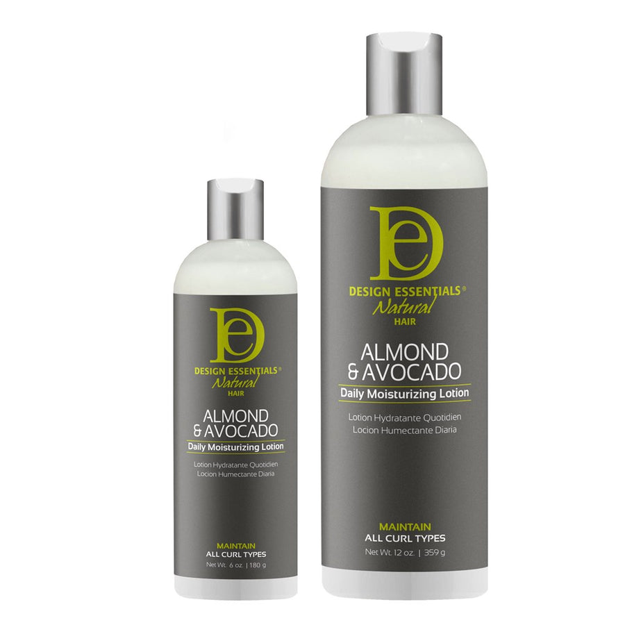 Give your hair the daily refresh it deserves. Our Design Essentials® Natural Almond & Avocado Daily Moisturizing Lotion is an ultra-lightweight botanical blend of jojoba oil, olive oil, and cocoa butter. This lotion moisturizes and revitalizes dry weaves, curls, and coils without weight hair down. The beautiful result: Soft, manageable, frizz-free hair.