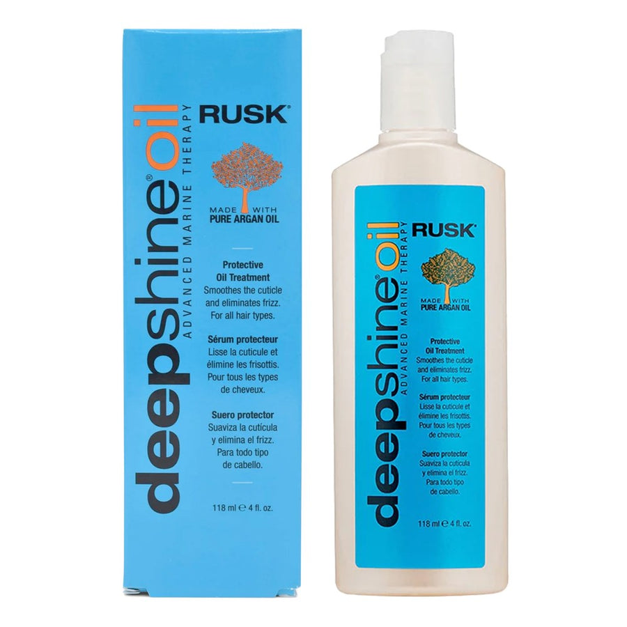 RUSK Deepshine Oil Protective Oil Treatment is a marine mineral-enriched argan oil treatment that smoothes the cuticle, eliminates frizz, and improves elasticity and hydration, leaving hair soft, silky, and manageable.