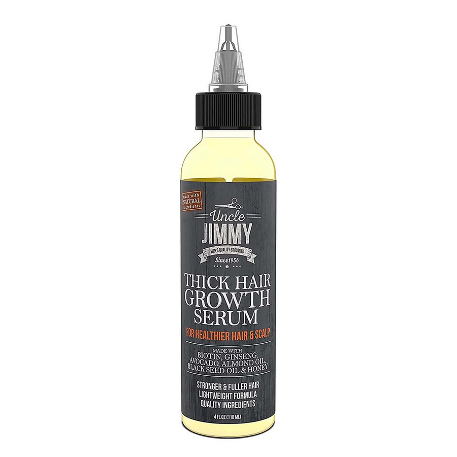 • If your hair is beginning to thin or you want to take a proactive approach to hair loss, this is the hair growth serum for you! Our nutrient-rich formula nourishes your hair from root to tip. The ginseng fortifies your scalp, encouraging healthy new growth. The biotin strengthens your hair and minimizes breakage by delivering nutrients to your hair. The honey and black seed oil moisturize your hair and scalp to stimulate growth. This intense formula is gentle enough for all hair types, including straight, curly, and kinky hair. A little bit of serum goes a long way. The formula is lightweight so it won‚Äö√Ñ√¥t weigh your hair down, but it will add a healthy shine. Follow up with your preferred Uncle Jimmy hair products. Use daily for thick, healthy, and nourished hair.